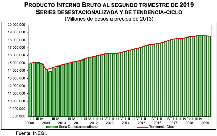 El INEGI reportó que el PIB de México en el segundo trimestre fue de 18 billones 537 mil 324 millones de pesos, apenas por encima de los 18 billones 533 mil 605 millones del primer trimestre, un crecimiento prácticamente nulo.